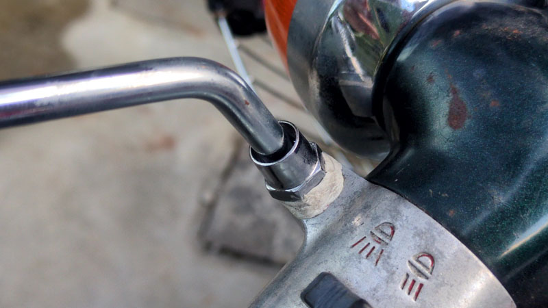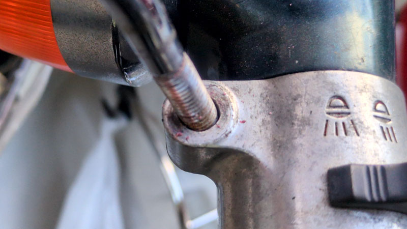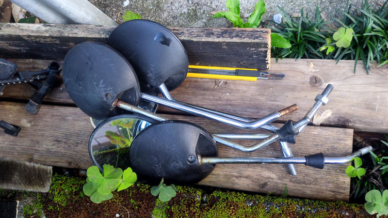 数年前、ユミコちゃんが転倒させたときに左のミラーが折れて、折れた破片は除去できたもののネジ穴が広がってしまいました。普通にはミラーを取り付けられなくなりました。