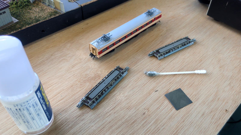 これをすべてのレールにやらないと走らないってことね。レール磨きがが終わるまでフレキシブルレールでモジュールをつなぐのもお預け。
