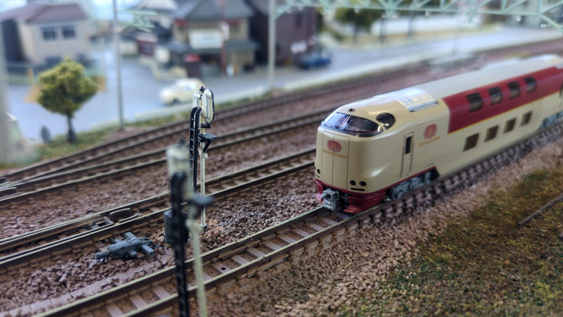 レールを磨いていないけれど、285系を載せてみました。やっぱりベニヤ板の上にただレールを置いただけの状態とは、臨場感が全然違いますね。