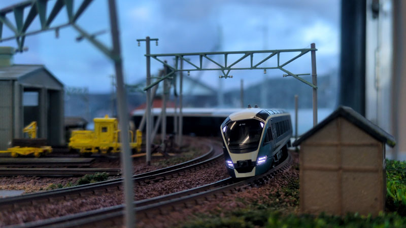 コーナー部分は少しレールを磨いたので、E261系を置いて通電してみました。82号の窓を通して、薄暗くなってきた現実の外の景色が偶然的にマッチしています。