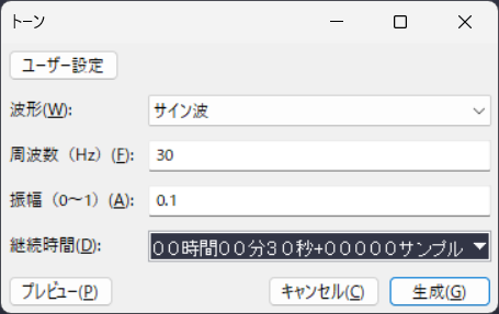 発表中ずっとBGMが鳴り続けていればいいとは思うのですが、音楽をそのまま流し続けるのはちょっと…けど無音ファイルだったら音欠けに効果がないかも。ということで、Audacityをインストールして、「生成」→「トーン」から30Hz・振幅0.1・30秒の音を作りました。